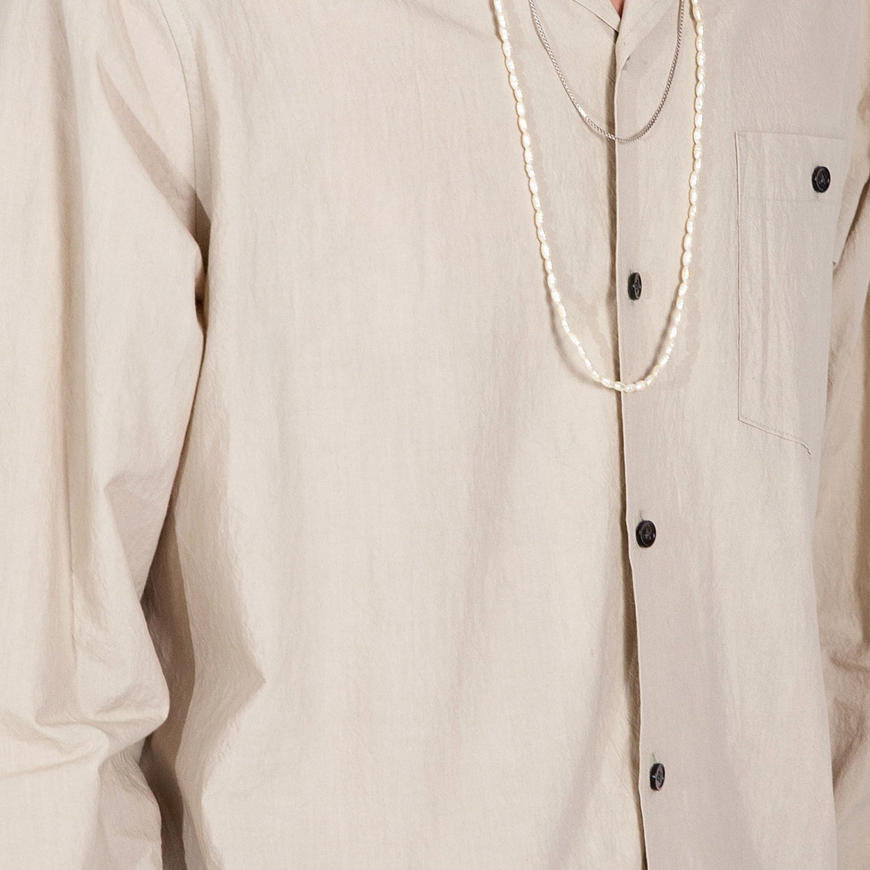 Our new "Reinaldo" convertible-collar shirt is cut in a shorter boxy fit, and given a utilitarian twist in a textured khaki cotton poplin which is specially dyed and finished to achieve a vintage crinkled aesthetic.