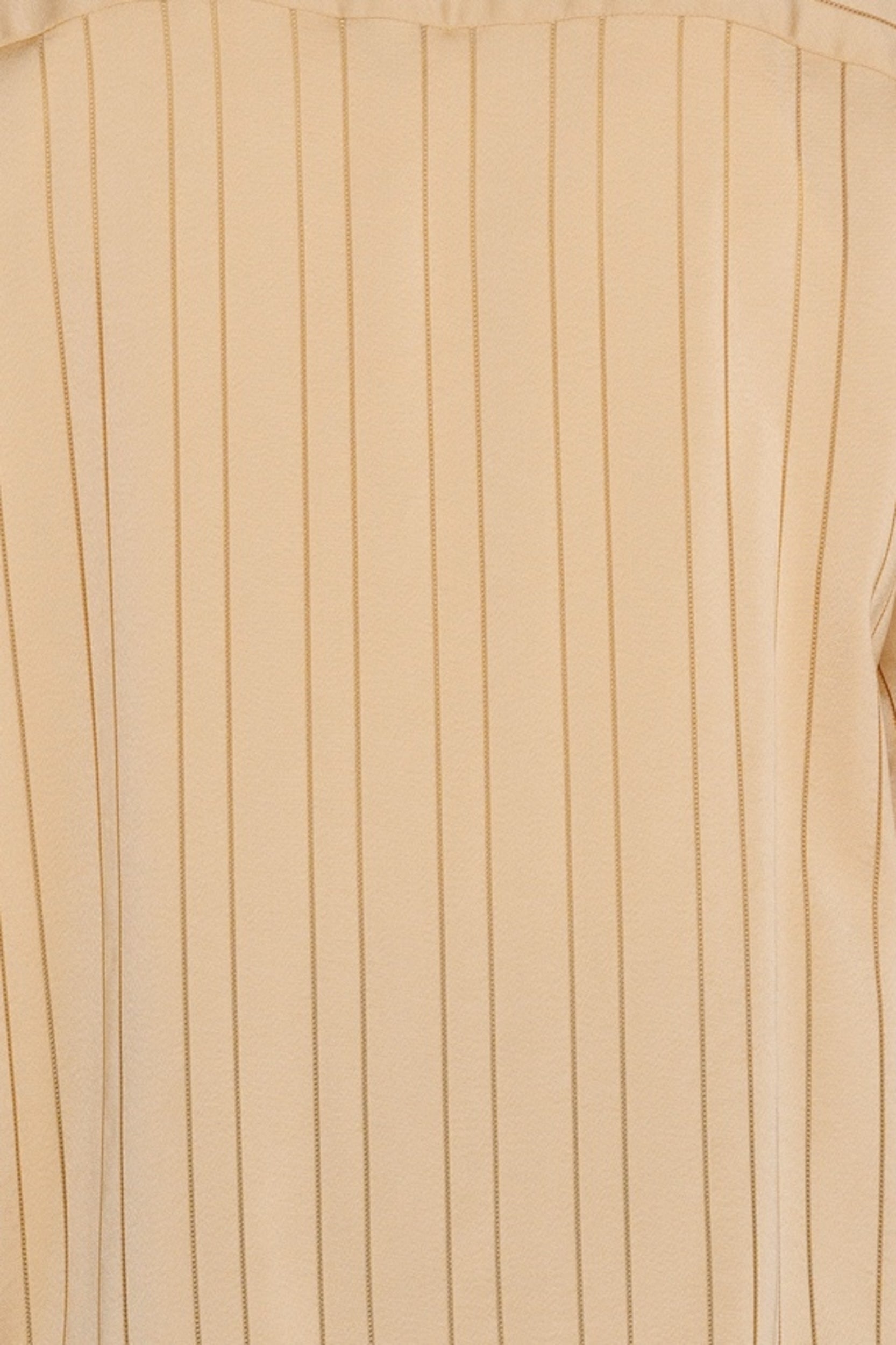 One of our popular silhouettes, the "Valenzuela", is a modern update on a traditional baseball shirt. Cut in a unique golden cupro blend georgette with stripes inspired by the pinstripes on jerseys, the relaxed styling and rich color will provide an elegant summer fit.